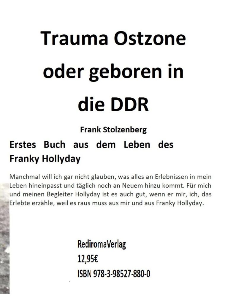 Frank Stolzenberg alias Franky Hollyday, kam am 29.11.1958 in der Ostzone, damalige DDR, in Altenburg Thüringen, ganz ungewöhnlich in einer kleinen Klinik zur Welt. In der DDR gab es bis zu ihrem Untergang nicht viel Wahlmöglichkeiten. Ein riesiges Gefängnis und eine Diktatur aus Arbeitern und Bauern, kaum wirklich Intellektuelle oder Akademiker in Führungspositionen, ein System aus Menschen, die sich weiter gegenseitig das Leben massiv einschränkten, in ein solches System wurde Franky hineingeboren, da wuchs er auf.